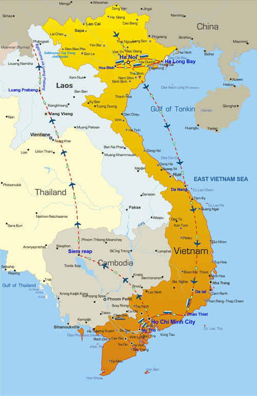 In Vietnam 14 days / 13 nights: HANOI - MAI CHAU VALLEY / BAN LAC VILLAGE - HALONG BAY - DA NANG - HOI AN ANCIENT TOWN - DALAT HIGHLAND - PHAN THIET Beach / MUI NE Bay - HO CHI MINH CITY In Cambodia 4 days / 3 nights: SIEM REAP (Angkor Complex) - KULEN MOUNTAIN In Laos 4 days / 3 nights: LUANG PRABANG
